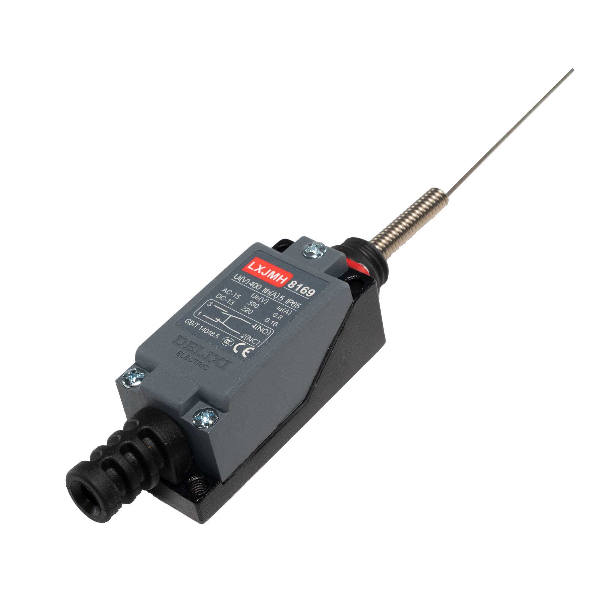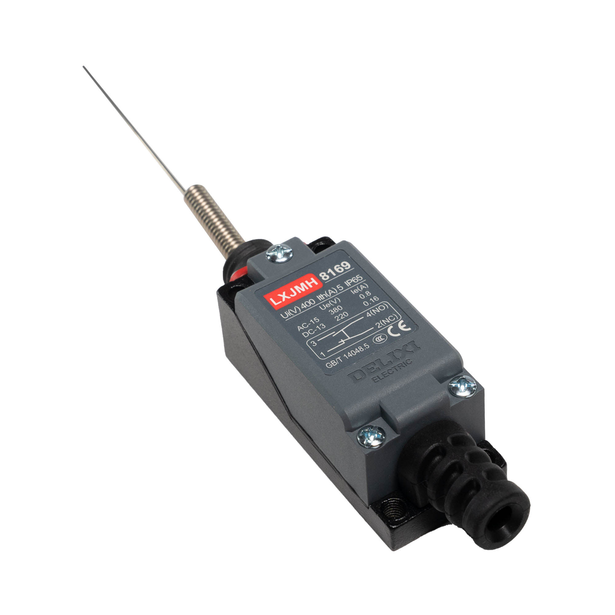 Final de carrera metálico aguja flexible tipo resorte IP 65 con certificación RETIE. Marca DELIXI. Cantidad mínima de venta 10 unidades.