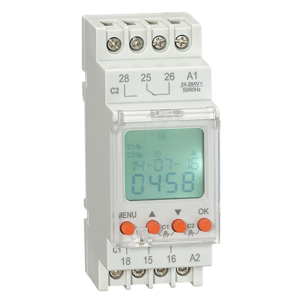 Programador semanal digital 24-264 VAC/DC con reserva horaria.
